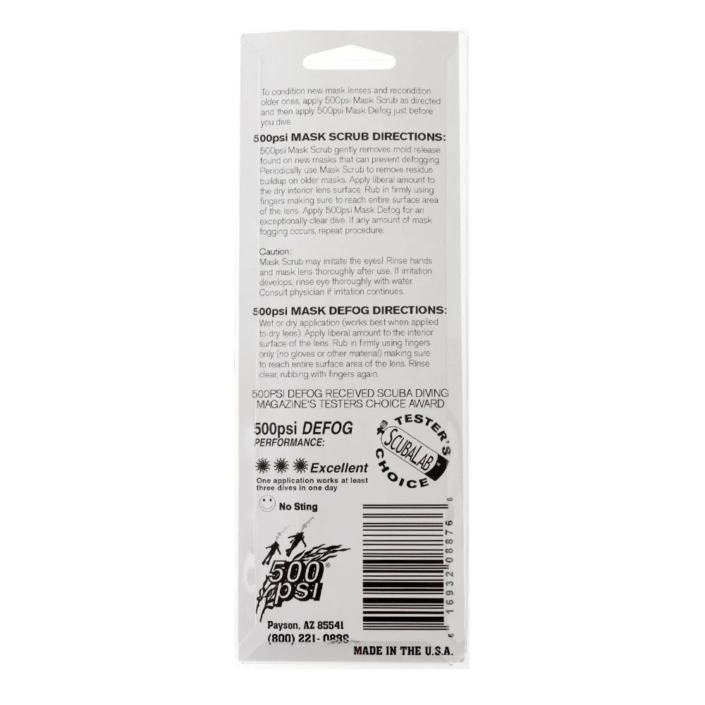 The 500psi Mask Scrub and Defog Combo Pack comes with everything you need to prep and condition new mask lenses and recondition older ones. To condition new mask lenses and recondition older ones, apply Mask Scrub as directed and then apply Mask Defog just before you dive.
