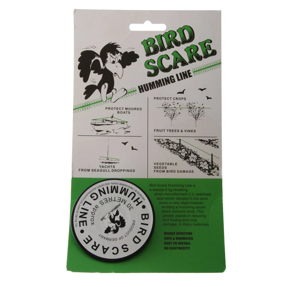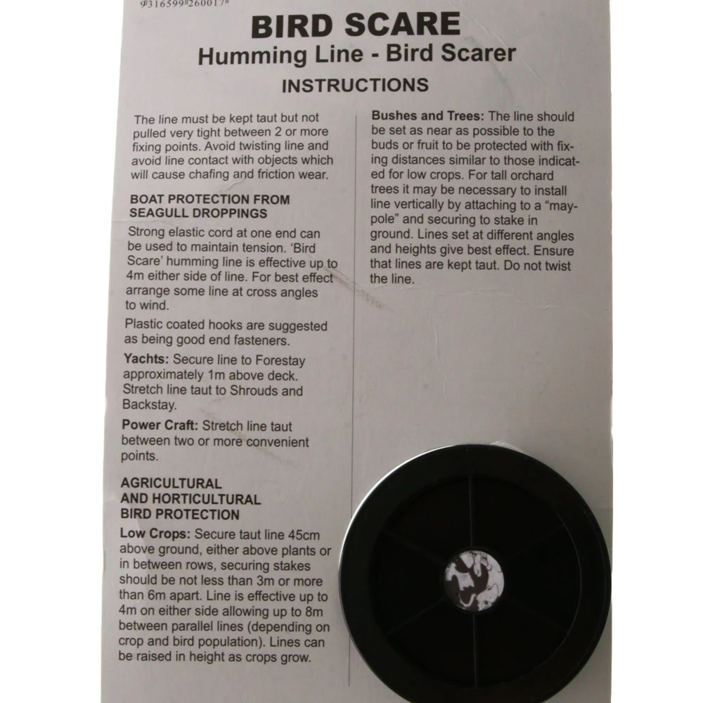 Bird Scare Humming Line is a special 5kg breaking strain monofilament U.V. stabilised tape which vibrates in the wind (even a very slight breeze) emitting a humming sound which detracts birds. This greatly assists in reducing bird fouling and crop damage, in many instances.