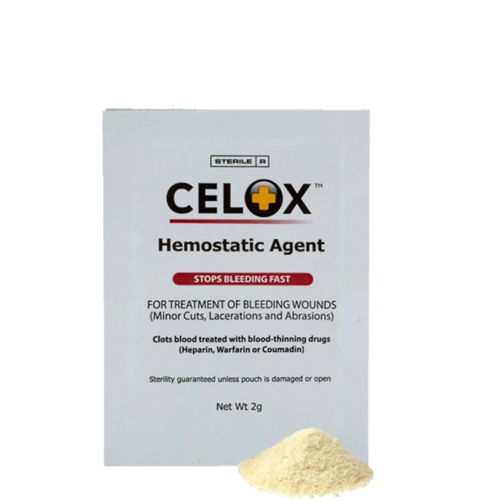 To use – tear it open, pour it on, cover and apply pressure. It’s that simple! Celox Granules easily wash away with water or saline. CELOX Granules are completely bio-compatible and bioabsorbable. Any remaining granules are safely, naturally absorbed by the body
