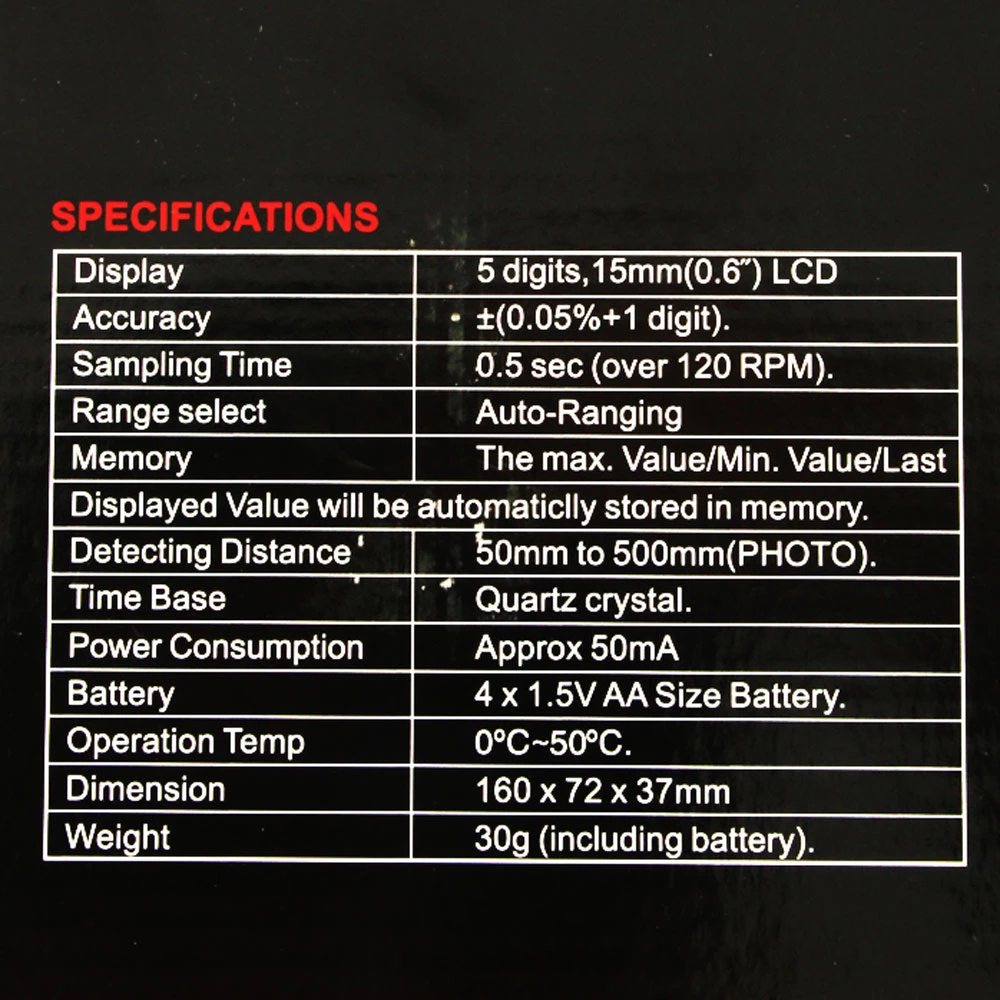 - Resolution: 0.1RPM (2.5 – 999.9 RPM), 1RPM (over