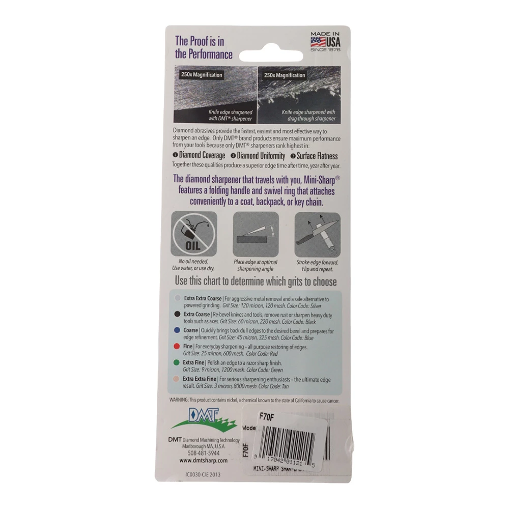 The DMT Diamond Mini Sharpener makes blades and tools sharper than ever. Sharpening with diamonds is fast and easy. No messy oils needed – sharpen dry or with water. Its durable construction guarantees many years of consistent performance and reliable service. This mini sharpener is also incredibly lightweight and portable. You can take it wherever you go. With the handy key chain swivel ring, you can attach it to your backpack, zipper pull or keys. The DMT Diamond Mini Sharpener is great for chefs, woodworkers, fishos and other professionals who rely on their sharp knives and tools.