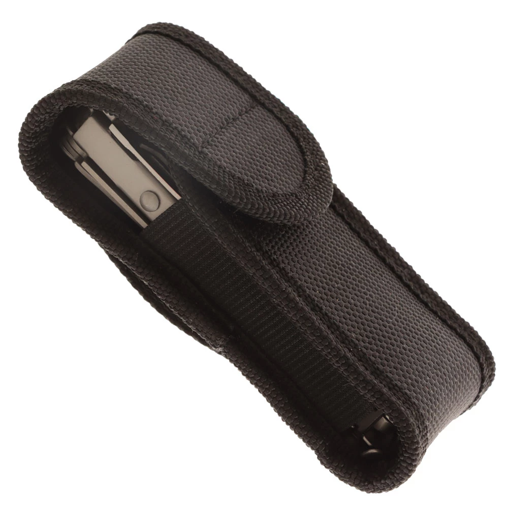 It includes the following fold-out tools: needle nose pliers, regular pliers, wire cutter, blade, scissors, multi-purpose cutter, bottle opener, can opener, cross-head screwdriver, reamer, nail file, saw and keychain attachment.