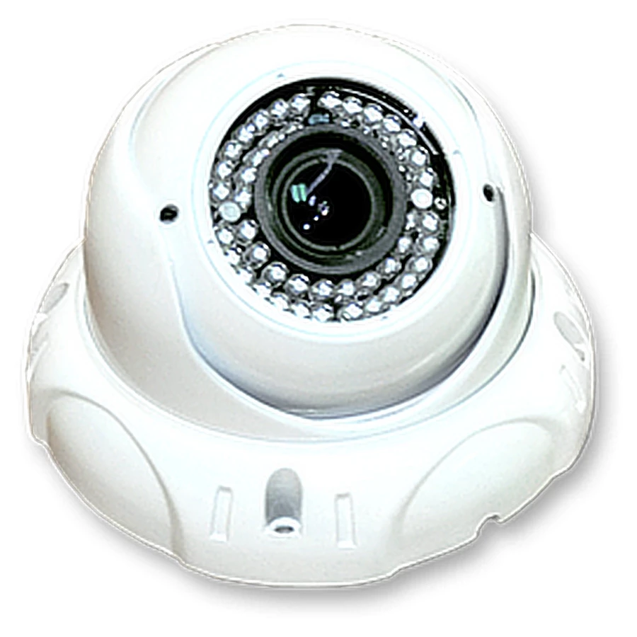 Varifocal Dome Camera, MFG# C70, Surface Mount, varifocal 2.8-12mm lens (manually adjusted), 48 IR LEDs for night operation. On-screen menu for normal or reverse image, time stamp, camera ID, language, day/night, and picture adjustments.