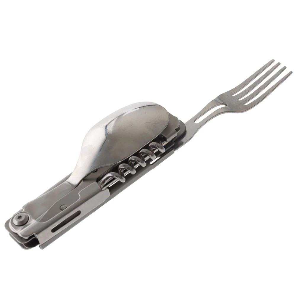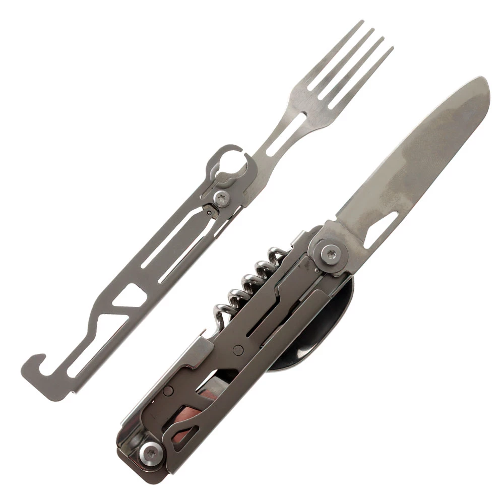 The handy Multi-Function Pocket Utensil Set includes: knife, spoon, fork and bottle opener.
