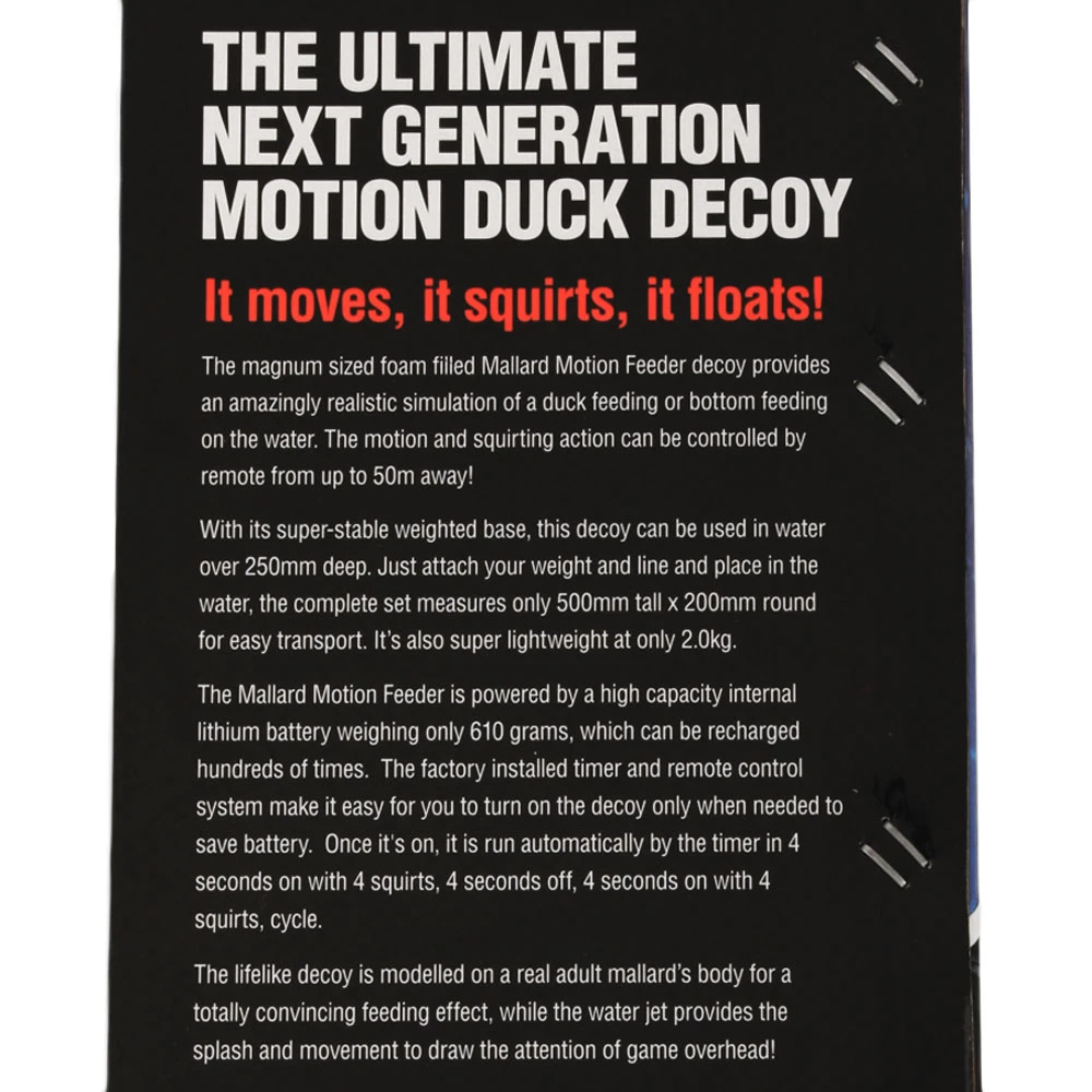 The Premier Series Mallard Drake Motion Feeder Decoy creates an amazingly realistic impression of a duck bottom feeding on the water. It’s modelled after a real adult mallard for a totally convincing feeding effect. The motion and squirting action can be controlled remotely even from 50 metres away. With its super-stable weighted base, the decoy can be used in waters over 250mm deep. This motion feeder also features a high-capacity lithium battery which can be recharged hundreds of times. The Premier Series Mallard Drake Motion Feeder Decoy expertly moves and splashes water like a real duck, to invite birds flying overhead.