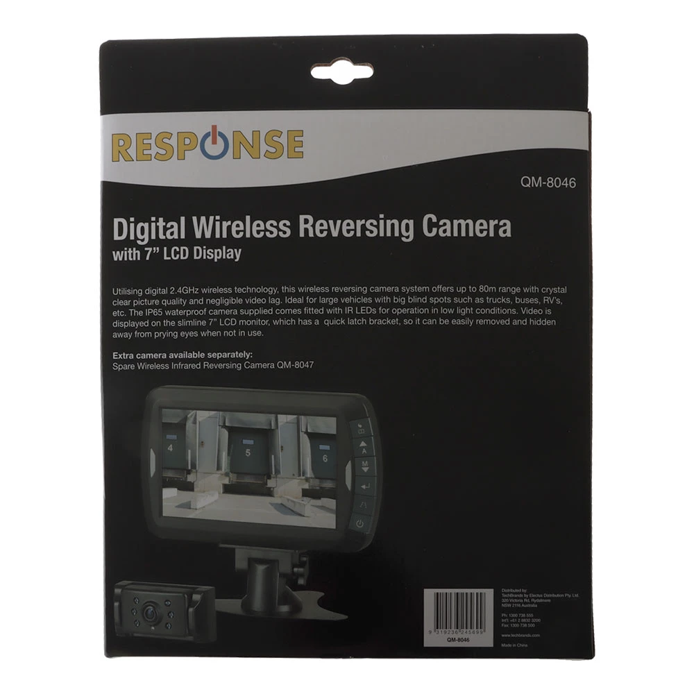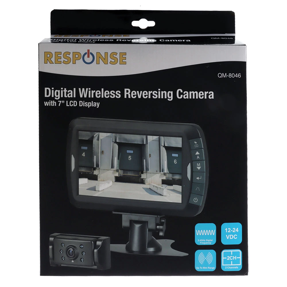 Utilising digital 2.4GHz wireless technology, this QM-8046 Digital Wireless Reversing Camera Kit offers up to 80m range with crystal clear picture quality and negligible video lag. It’s ideal for large vehicles with big blind spots such as trucks, buses, RV’s, etc. The IP65 waterproof camera supplied comes fitted with IR LEDs for operation in low light conditions. The video is displayed on the slimline 7in LCD monitor, which has a quick latch bracket, so it can be easily removed and hidden away from prying eyes when not in use.