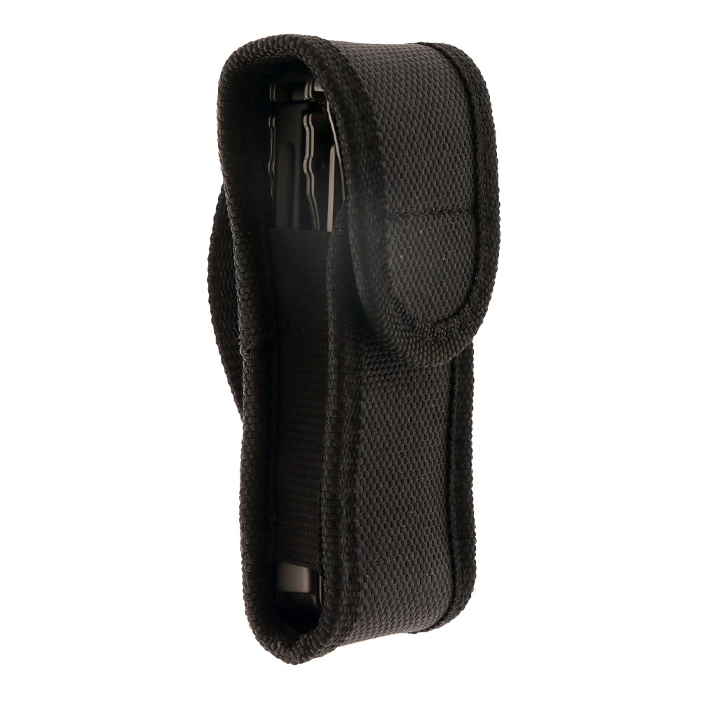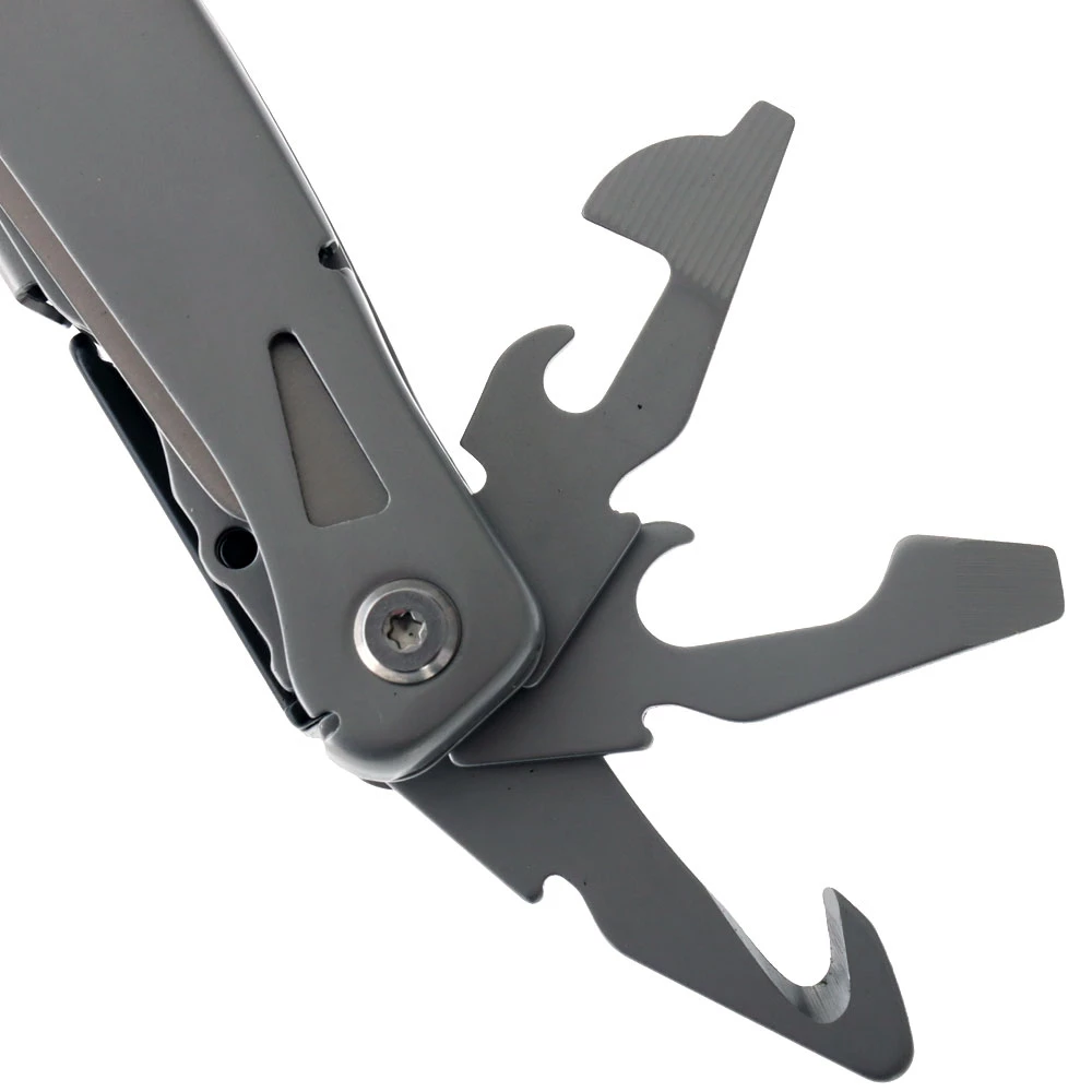It includes the following fold-out tools: needle nose pliers, regular pliers, wire cutter, blade, scissors, multi-purpose cutter, bottle opener, can opener, cross-head screwdriver, reamer, nail file, flat screwdriver and belt clip.