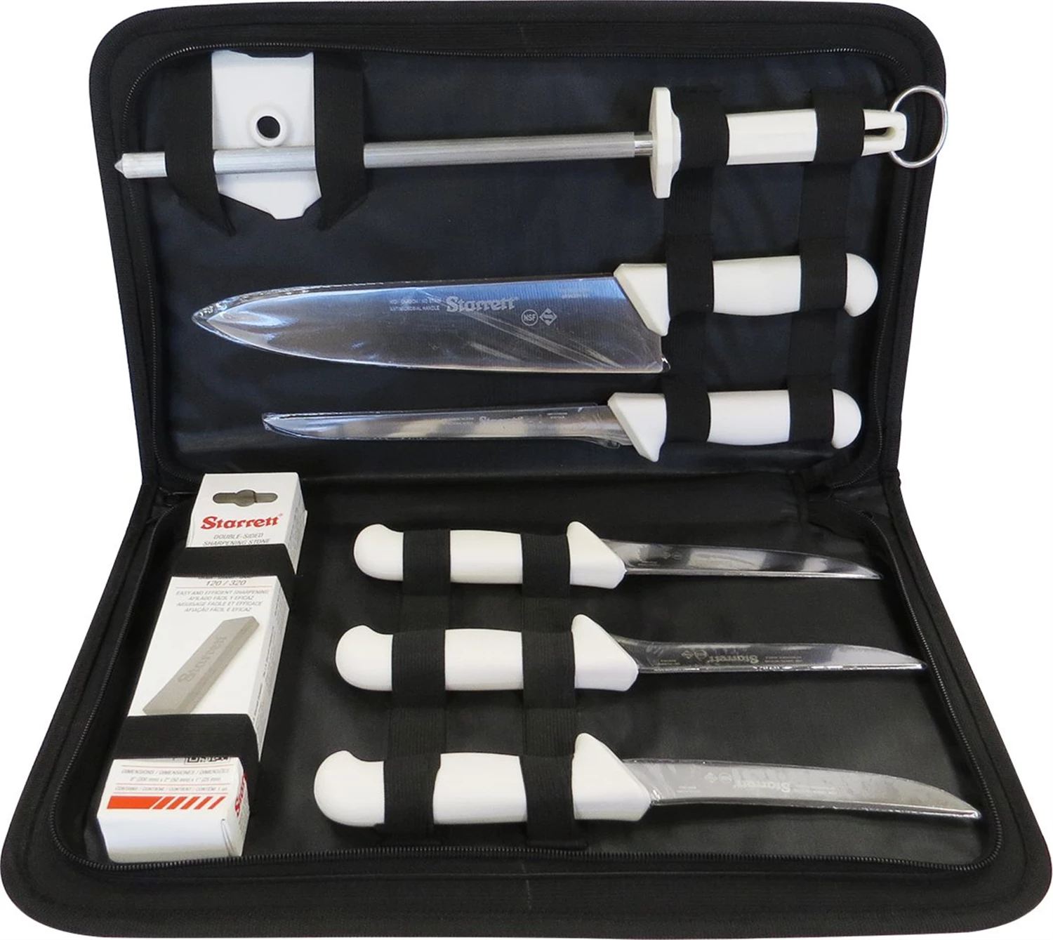 The Starrett 304 Professional Knife Set is made from durable stainless steel. Masterfully crafted to perfection, the set comes complete with 5 razor-sharp blades and sharpening acessories in a handy holding case. These blades are perfect for de-boning and trimming your meats. You get all eight great value items in this incredible professional knife set.