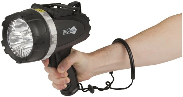 The ultra-bright Techlight Rechargeable Waterproof LED Spotlight is perfect for every boat, 4×4, camper or spotlight enthusiast. It’s fully waterproof (IP67) and floats in case you knock it into the water. Use the non-slip handle with wrist strap for handheld use or swing out the adjustable bracket for hands-free operation. The built-in rechargeable lithium batteries hold enough power for up to 75 minutes at full brightness or 150 minutes at low brightness. It also features a flashing SOS mode to attract attention if you are in distress, and intelligent circuitry regulates the brightness to avoid overheating and helps to extend battery life. A mains and in-car 12/24VDC charger are supplied, along with a 1.2m USB cable to charge from an available USB port or powe rbank.